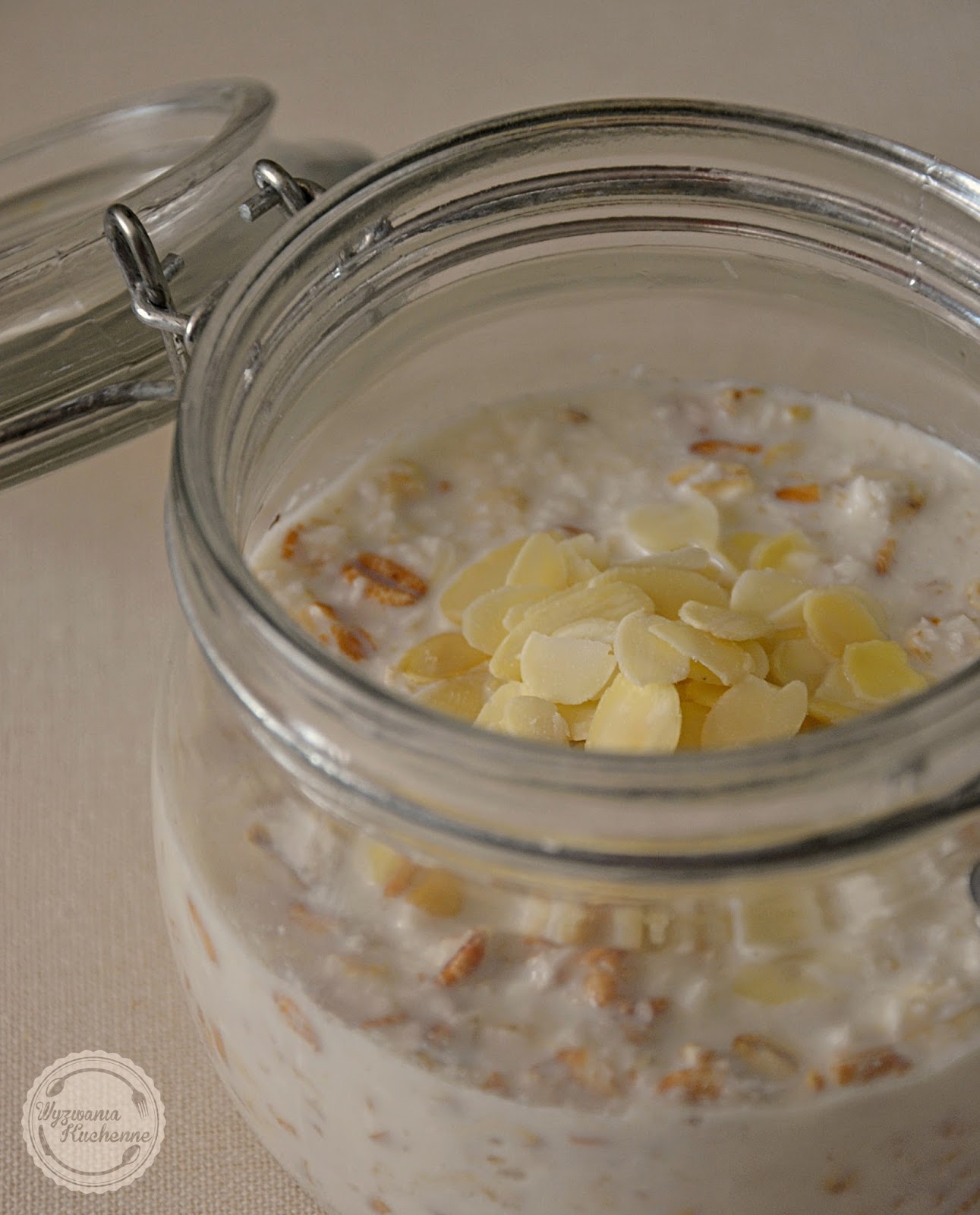 - Do słoika wsypać płatki i wiórki. Dodać mleko, ekstrakt i ewentualnie dosłodzić syropem klonowym.