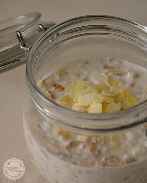 Nocna owsianka to chyba najszybsze zdrowe śniadanie dla zabieganych,a do tego bardzo pożywne i pyszne :) Smak kokosowo-migdałowy przypomina mi chrupiące pralinki Rafaello...