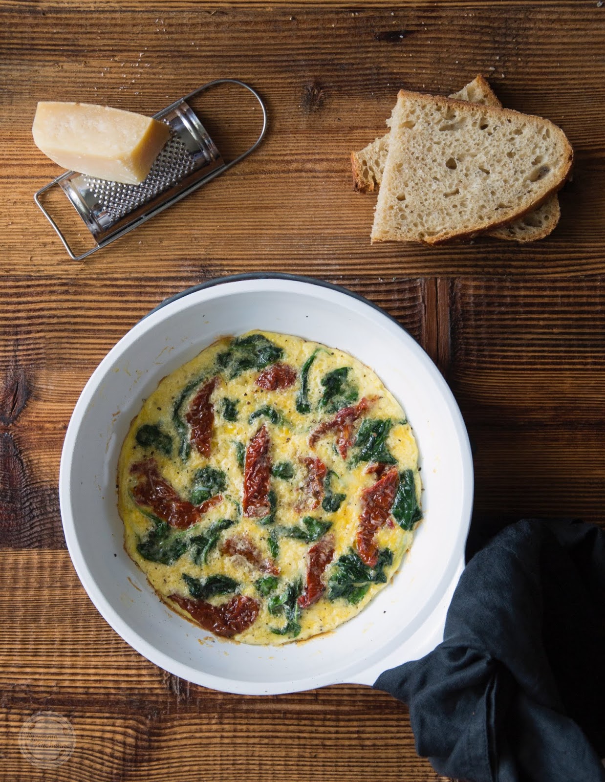 Pożywne śniadanie, które da nam energii na dobrych kilka godzin. Omlet z przesmażonym na maśle szpinakiem z dodatkiem czosnku, a do tego pokrojone w paseczki suszone pomidory i starty ser parmezan... To brzmi i jest pyszne!