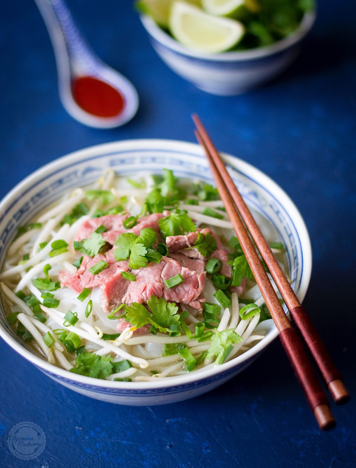 - Wyjąć mięso i przecedzić bulion przez sitko. W miskach ułożyć makaron, na nim paseczki polędwicy. Dodać kiełki, szczypior i kolendrę, Całość zalać gorącym bulionem, w którym ugotuje się polędwica. Skropić zupę sokiem z limonki i opcjonalnie doprawić pikantnym sosem sriracha.