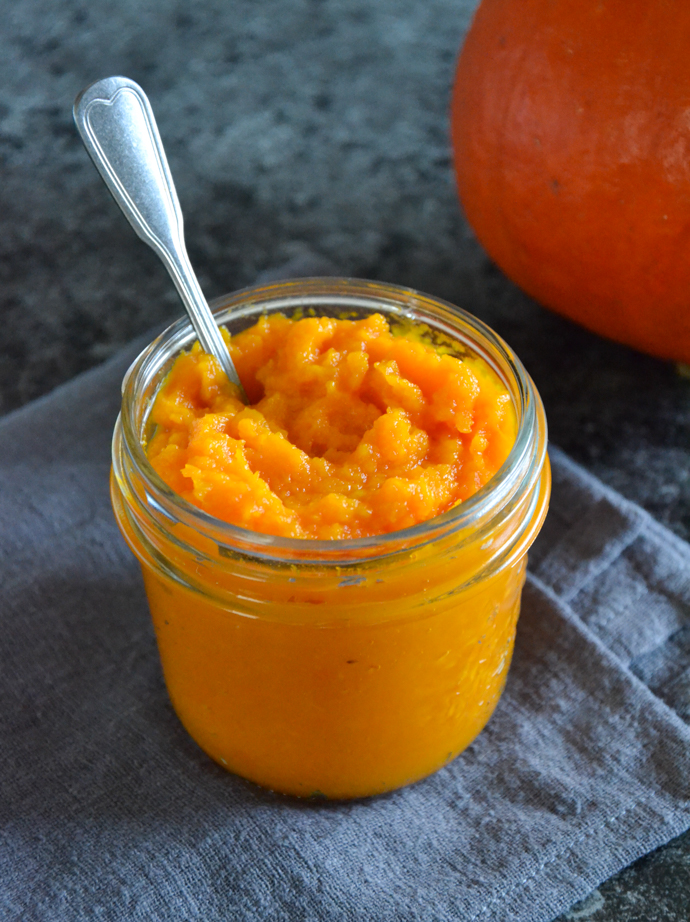 Puree z dyni to ciekawa baza wielu rozmaitych jesiennych wypieków, deserów a nawet past kanapkowych. Do jego zrobienia nadaje się każdy rodzaj jadalnej dyni. Moja ulubiona to Hokkaido, która ma intensywny pomarańczowy kolor skórki i miąższu i nie trzeba jej obierać. Gotowe puree, którego nie będziemy od razu wykorzystywać, można przełożyć do zamykanego słoika lub pojemnika i przechowywać w lodówce max. przez 4 dni albo zamrozić w woreczkach.