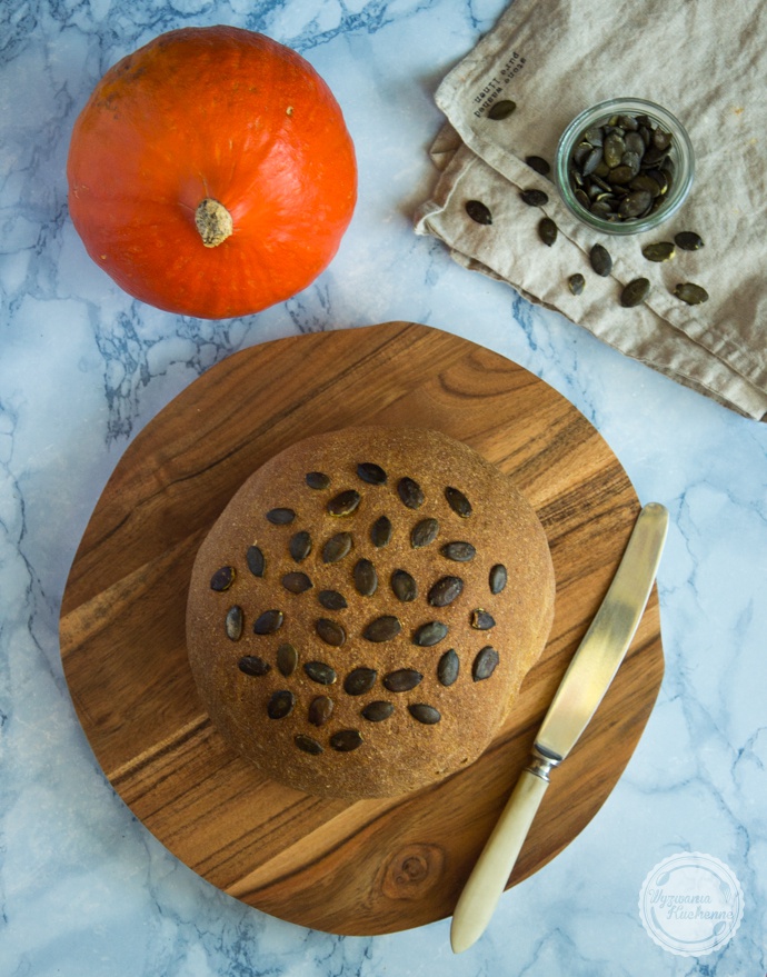 - Wyrośnięty bochenek posmarować wodą i posypać pestkami dyni. Wstawić do nagrzanego piekarnika i piec około 40 minut.