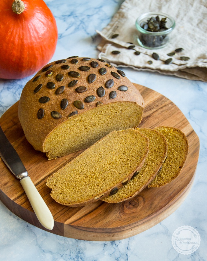Nie ma to jak domowy pachnący bochenek chleba bez podejrzanych ulepszaczy :) Dlatego też polecam przepis na pszenny drożdżowy chleb z mąki razowej z dodatkiem puree z dyni, na którą sezon już niebawem się zakończy. Ja użyłam gęstego puree z pieczonej dyni Hokkaido, która ma zdecydowanie najładniejszy mocno pomarańczowy kolor i wyrazisty smak.