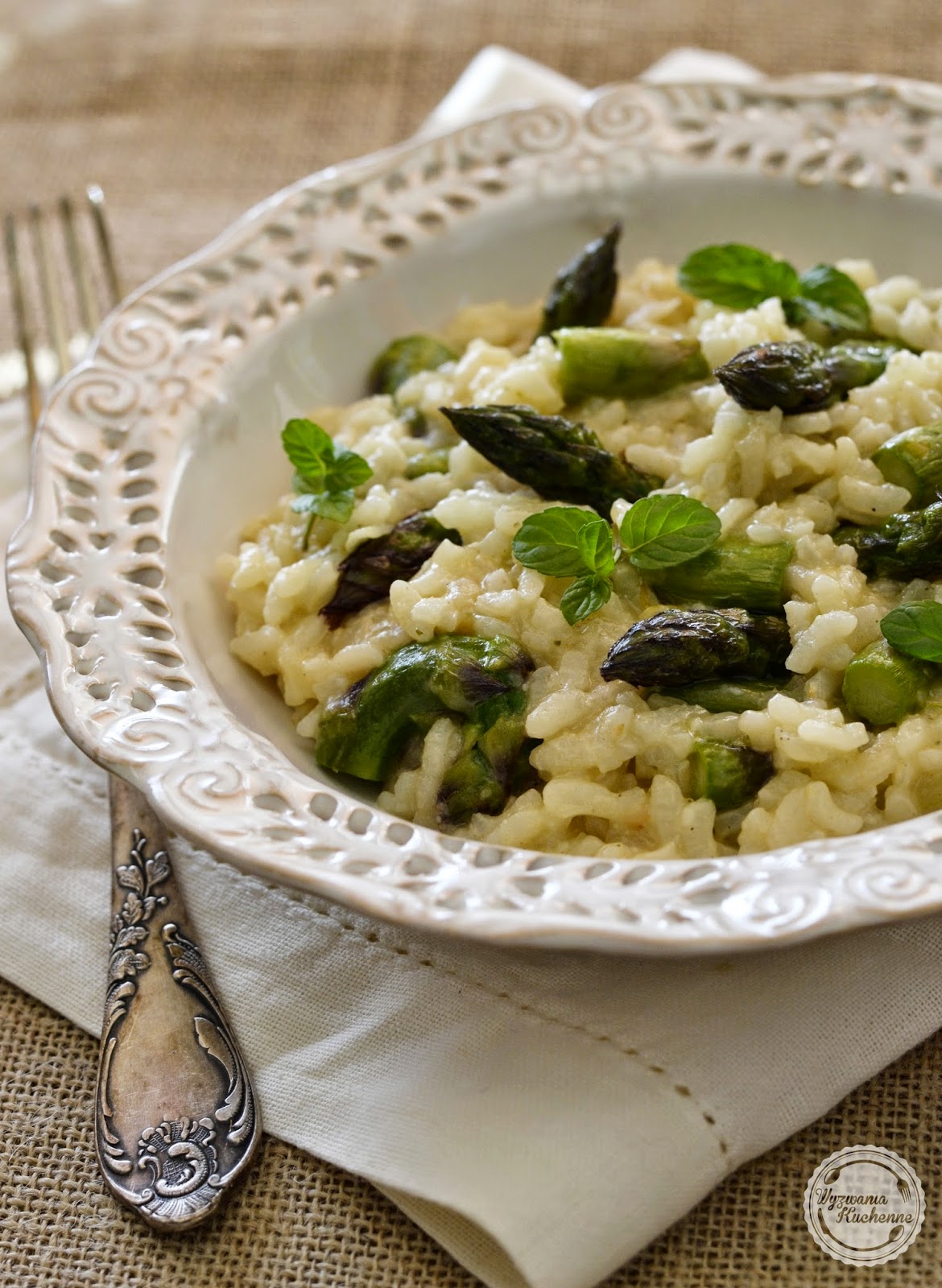 Sycące i pyszne włoskie risotto z duszonymi na maśle zielonymi szparagami i białym winem. Jeden z najsmaczniejszych i wbrew pozorom mało skomplikowany pomysł na szparagi.
