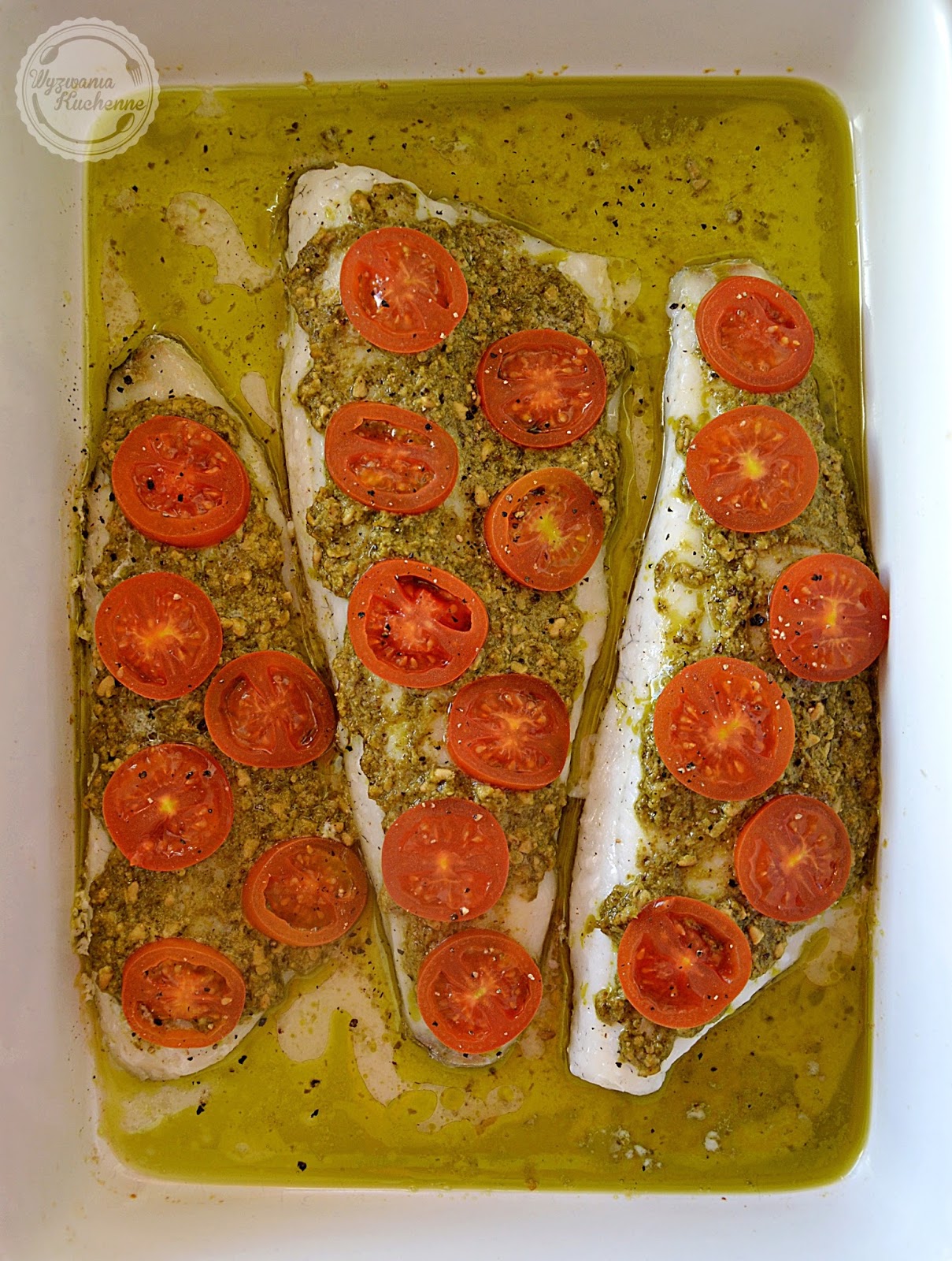 - Wierzch ryby posmarować pesto i obłożyć plastrami pomidorków.
