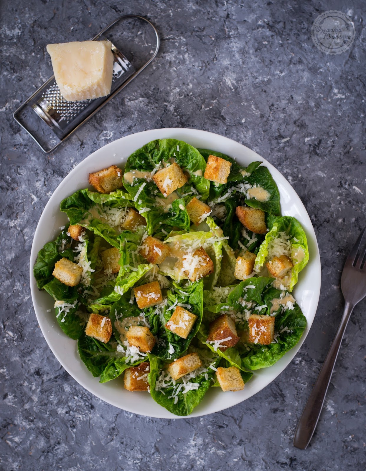 Klasyczna sałatka Cezar, czyli sałata rzymska polana dressingiem z oliwy, żółtka i filecików anchois a do tego chrupiące grzanki i spora ilość tartego parmezanu. Ja wolę tradycyjną wersję, ale dla urozmaicenia dodaję się do niej również kurczaka lub jajko. Jest zdecydowanie wtedy bardziej syta i może stanowić samodzielne danie obiadowe.