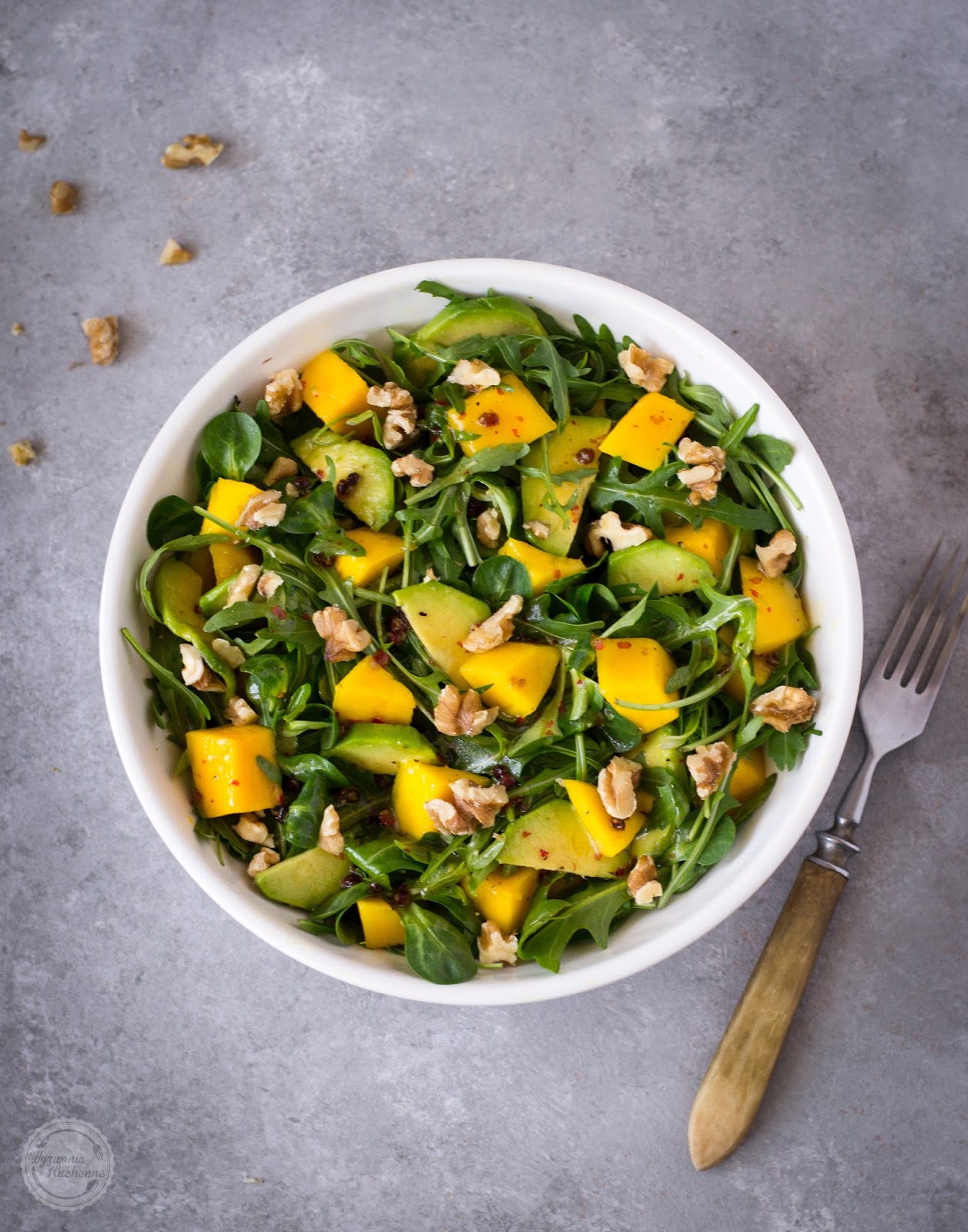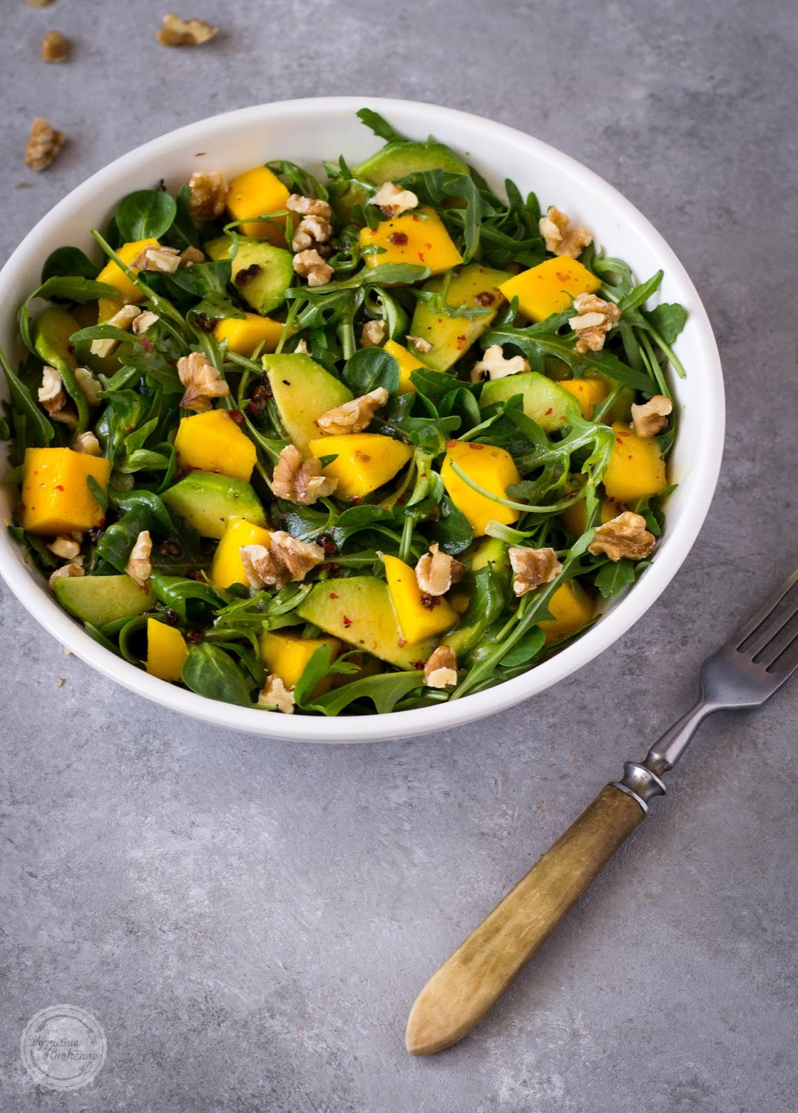 - Na talerzu ułożyć porcję rukoli, następnie mango i awokado. Polać całość sosem i posypać orzechami.