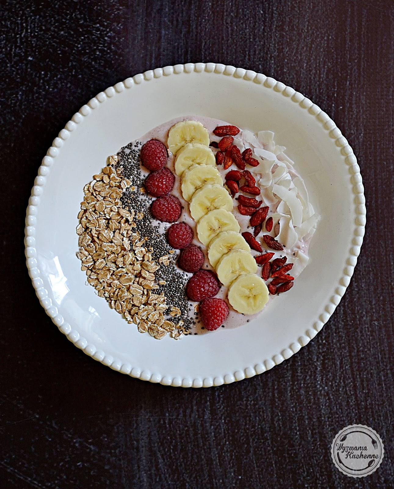 dodatki np. płatki orkiszowe, chia, maliny, banan, jagody goji, płatki kokosowe