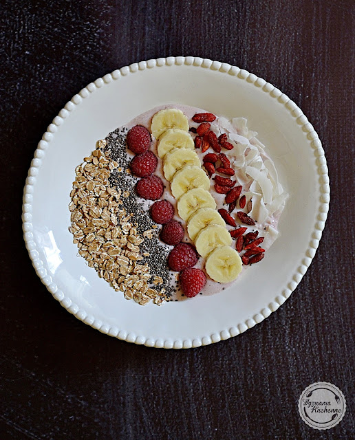 Idealnie śniadanie lub deser w wersji fit - miska pełna smoothie i ulubionych dodatków takich jak świeże owoce, nasiona, pestki, orzechy, superfoods oraz płatki śniadaniowe. Prawdziwa bomba witamin!