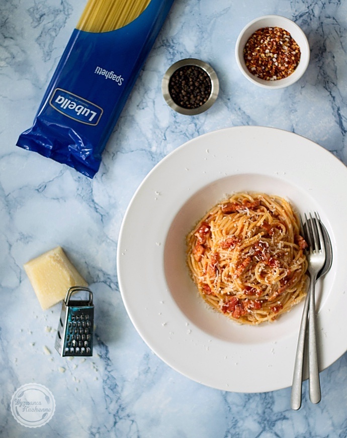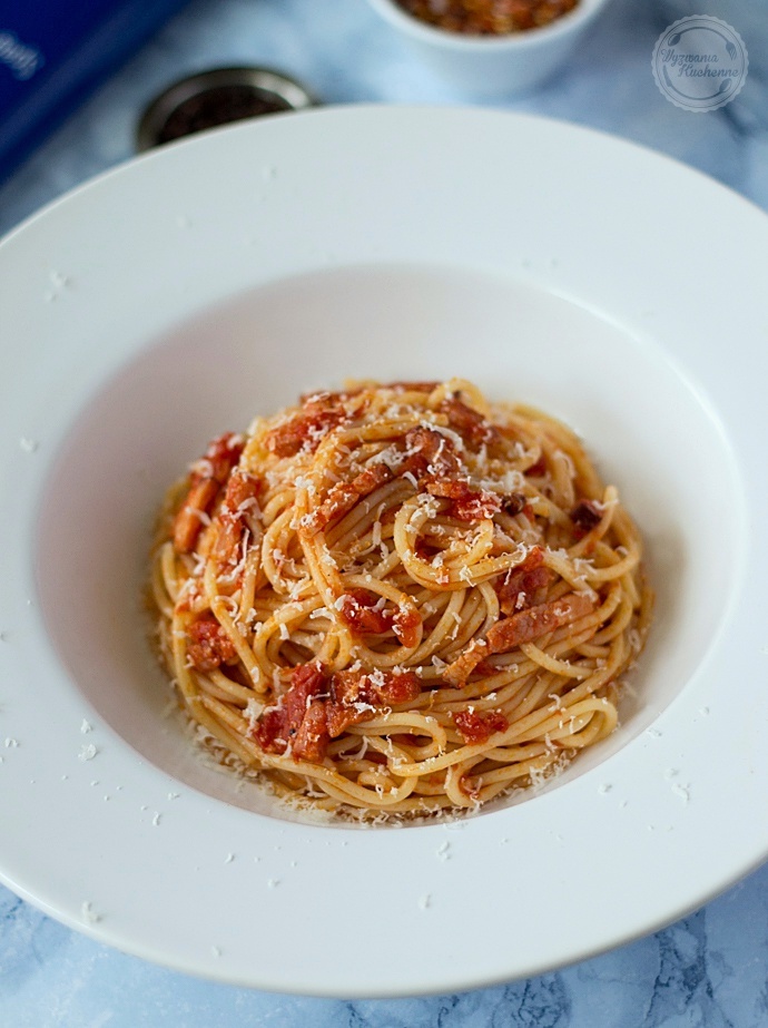 Błyskawiczna i syta tradycyjna włoska pasta, czyli makaron z lekko pikantnym sosem Amatriciana, którego główne składniki to podsmażone wieprzowe podgardle (guanciale) i pomidory. Nie może w nim zabraknąć również twardego owczego sera pecorino romano. Nazwa sosu pochodzi od niewielkiego włoskiego miasta Amatrice w rejonie Lacjum.