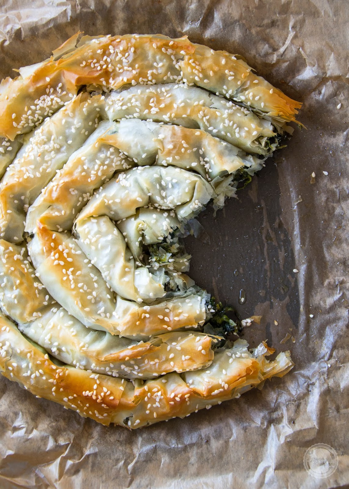 Grecka spanakopita to nic innego jak chrupiące ciasto filo z nadzieniem ze szpinaku i sera feta. Możemy ją przygotować w postaci dużej zapiekanki lub trójkątnych pierożków albo tak jak ja w formie ślimaka, który ciekawie się prezentuje i nie potrzeba do niego żadnej foremki.