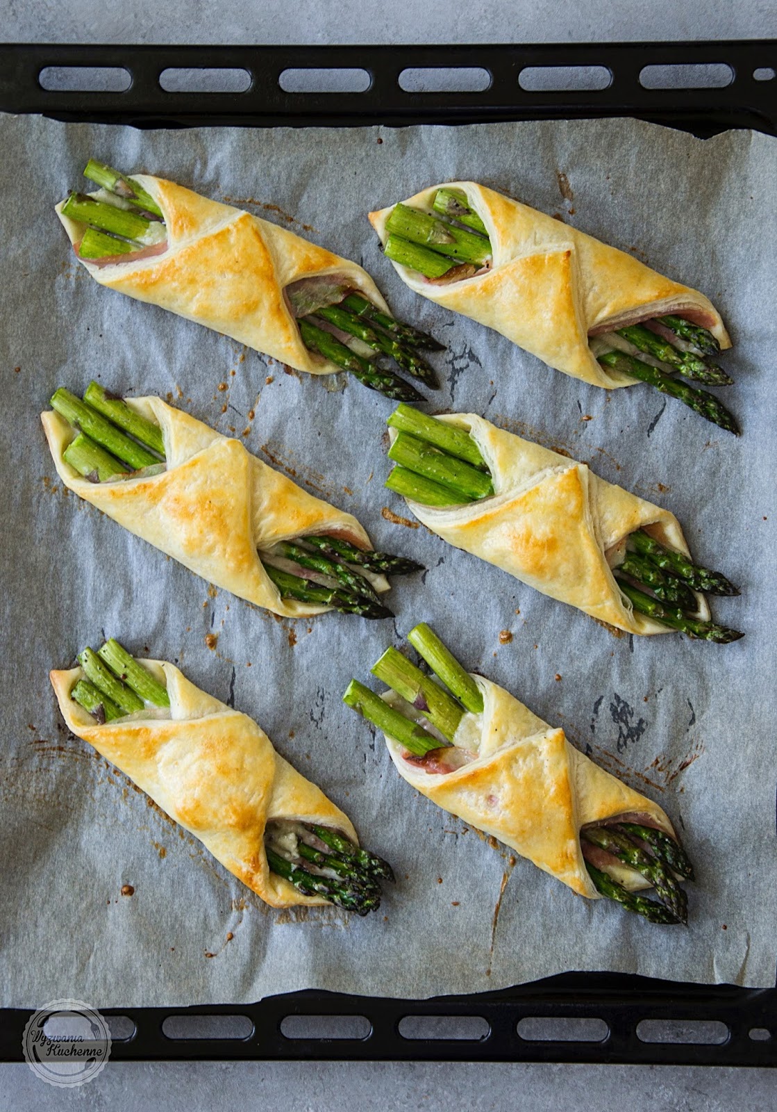 - Płat ciasta francuskiego podzielić na 6 kwadratów. Każdy posmarować roztrzepanym jajkiem, ułożyć na nim kolejno plaster szynki, po 3 szparagi na ukos, a na nich starty lub pokrojony parmezan.