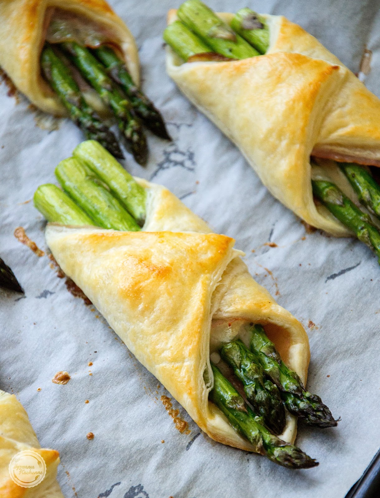 - Płat ciasta francuskiego podzielić na 6 kwadratów. Każdy posmarować roztrzepanym jajkiem, ułożyć na nim kolejno plaster szynki, po 3 szparagi na ukos, a na nich starty lub pokrojony parmezan.
