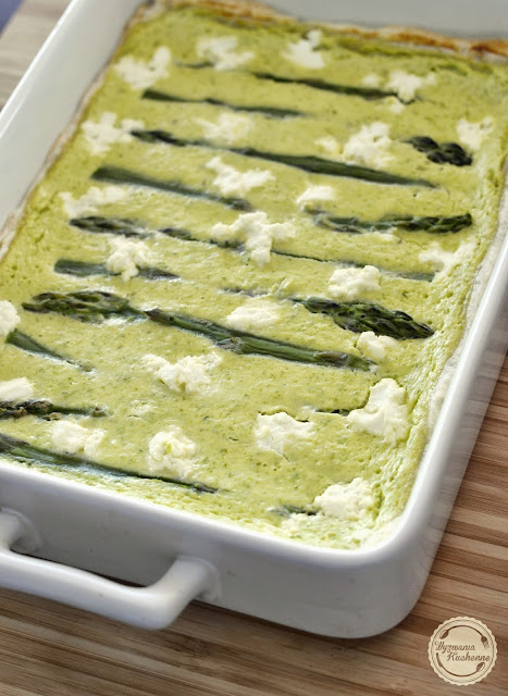- Następnie wyłożyć na nim pozostałe osuszone szparagi i pokruszony ser (ja tym razem użyłam ricotty).