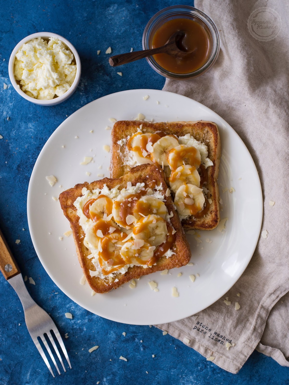 Złociste tosty francuskie na słodko pojawiły się już dawno na moim blogu w wersji podstawowej. Dzisiaj zrobiłam je z moimi ulubionymi dodatkami. Przyznaję, że niezbyt dietetycznie, ale raz na jakiś czas można zaszaleć ;) Natomiast w lżejszej wersji mascarpone można śmiało zastąpić mniej kaloryczną ricottą, a solony karmel miodem lub syropem klonowym i będzie równie smacznie.