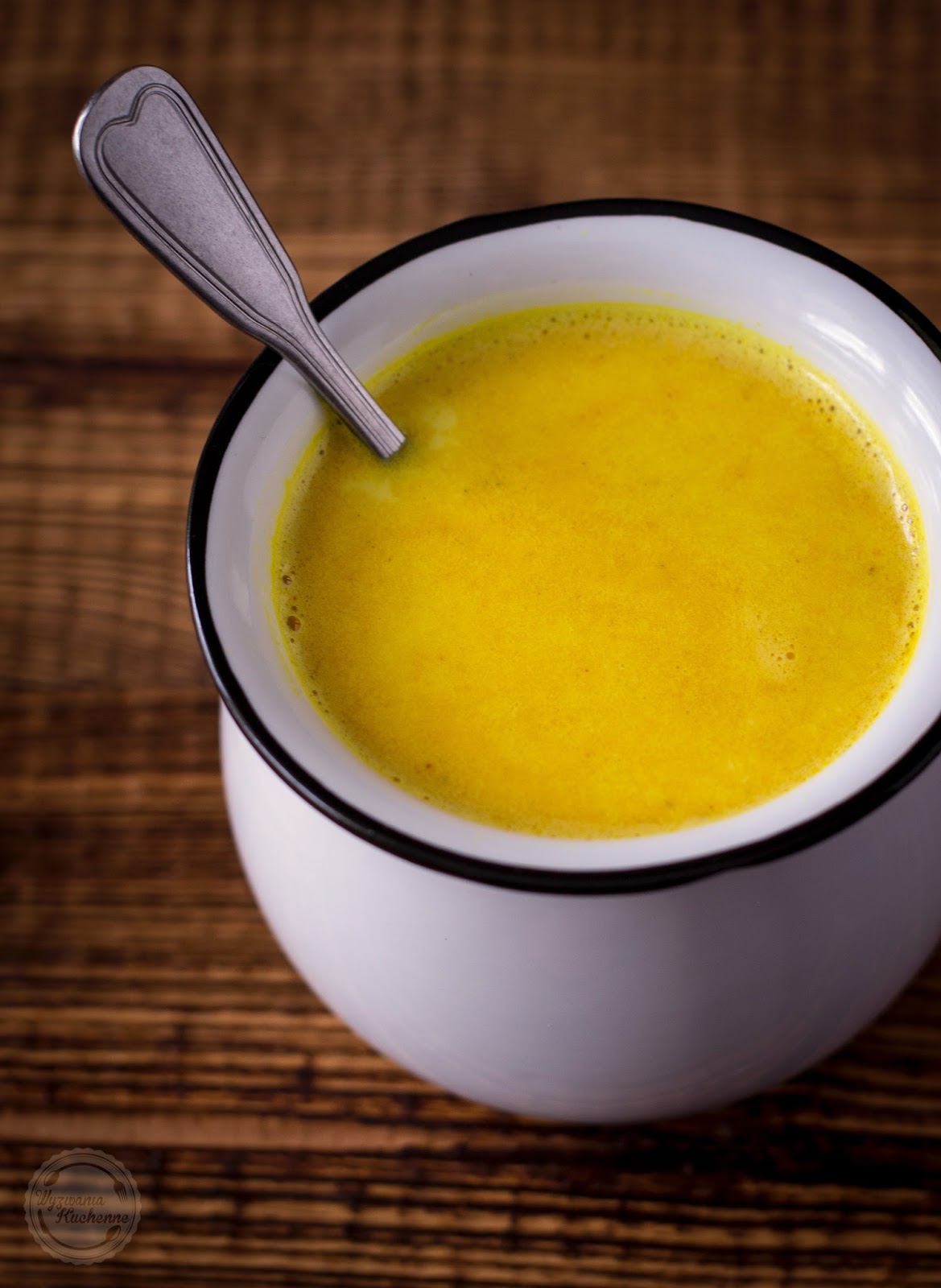 - W rondelku wymieszać wodę z kurkumą i pieprzem. Doprowadzić do wrzenia i gotować kilka minut na małym ogniu, często mieszając.
