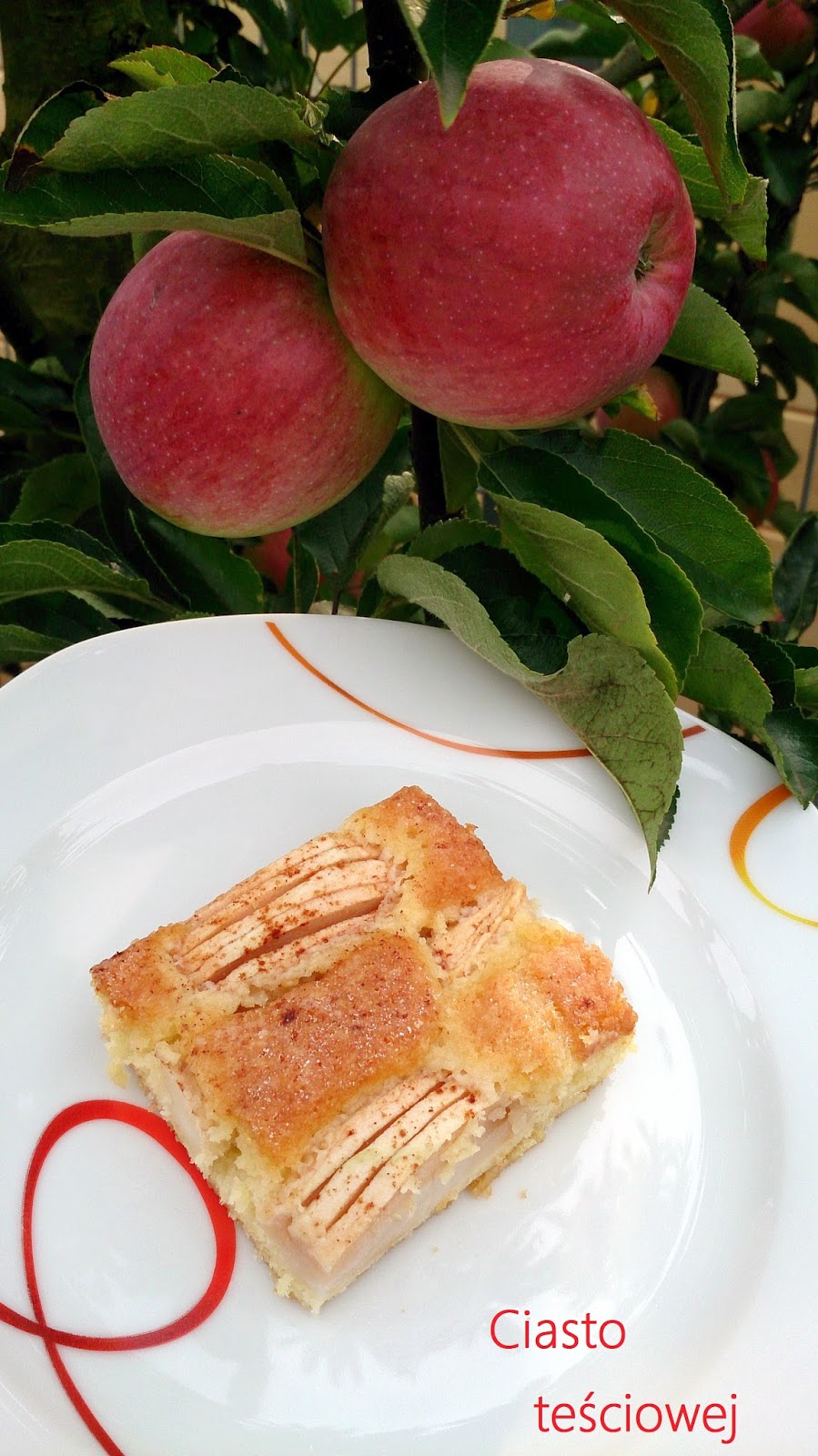 Zwykłe ciasto ucierane nadające się praktycznie pod każde owoce. Najlepsze jest ze śliwkami, ale piekłam je także z wiśniami, agrestem i jak zobaczycie poniżej z jabłkami.Przepis dostałam od teściowej (stąd nazwa), ale możecie spać spokojnie - mam super teściową, więc arszeniku jako składnika nie będzie ;) Za to wyjdzie wam wilgotne, delikatne ciasto pełne owoców. Poza tym to jeden z nielicznych przepisów w których nie używam wagi, bo wszystko mierze szklanką ( moje szklanki mają zawsze 250ml).