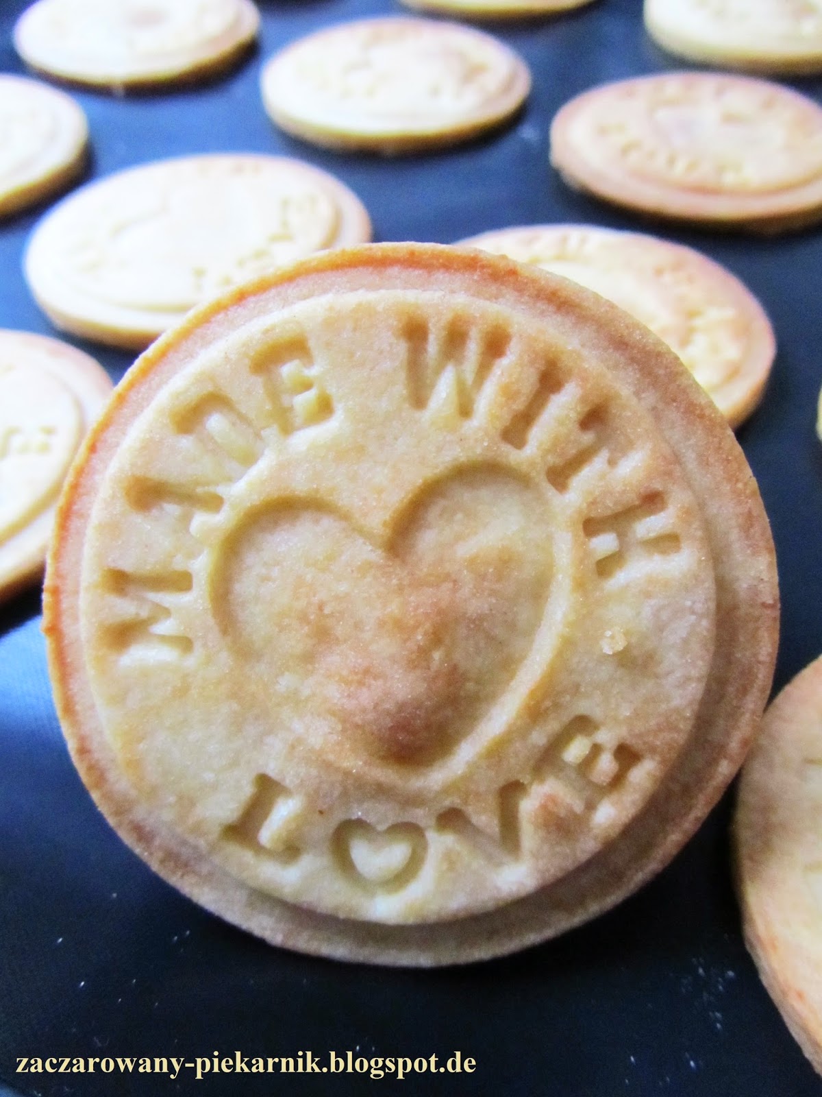 Schłodzone ciasto rozwałkować na grubość około 4 mm, podsypując mąką. Wycinać dowolne kształty lub jak ja przykładać i odciskać stempelki. (Jeśli zdecydujecie się na metodę „stempelkową” to ja najpierw odciskałam stempelki, potem je wycinałam okrągłą foremką do ciasteczek. Stempelki najlepiej każdorazowo oprószać w mące, by nie przyklejały się do ciasta). Ciasteczka układać na wyłożonej papierem do pieczenia blaszce przez około 12 – 15 minut w temperaturze 180ºC. Najlepiej wystudzić ciasteczka na kratce.