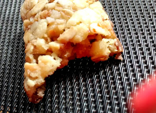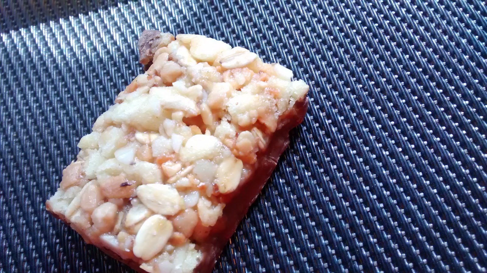 Orzechy są bardzo wyczuwalne i smaczne, natomiast skleja je bardzo słodki cukrowy klej :) Dla mnie zdecydowanie zbyt słodki i byłby ten batonik strzałem w 10 gdyby trochę tę słodkość zredukować.