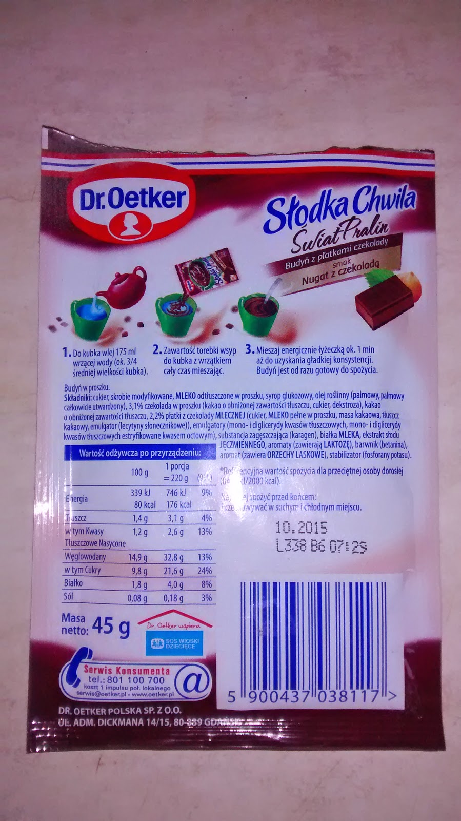 (zalać 3/4 kubka wrzątku ok. 175 ml, wsypać proszek i mieszać przez minutę). Dodatkowo zamieszczono skład i tabelę wartości odżywczych. A także standardowo informację o producencie.