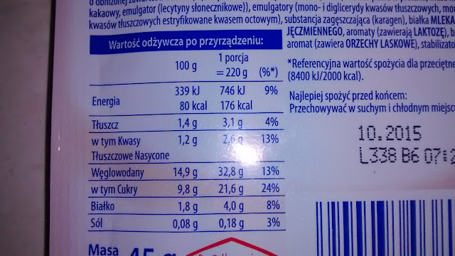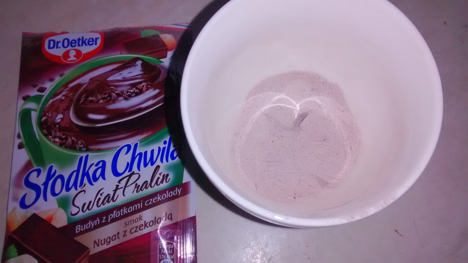 nie jest to wiele jak na porcję słodyczy, którą w dodatku można się najeść :)Wygląd:Proszek:Budyń ma wygląd bardzo drobnego proszku, w kolorze lekkiego mlecznego kakao. Gdzieniegdzie przewijają się drobinki ciemnej czekolady.