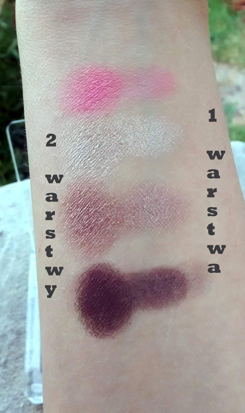 dość dobrze napigmentowane. Ale też zależy to od koloru. Najbardziej napigmentowany i pozostawiajacy najmcniejszą warstwę koloru jest najciemniejszy brąz. Bardzo dobrze sprawuje się też złoto-brązowy. Całkiem nieźle sprawa wygląda też z perłowo-brązowym, ale widać już, że jest on mniej napigmentowany, co wynika po trosze też z jaśniejszego odcienia. Najmniej wyrazistym kolorem jest najbardziej jaskrawy. A wydawać by się mogło, że to on będzie w tej palecie pełnił wiodącą rolę. Nie jest tak, że jest słabo napigmentowany, czy nie zdaje efektu. Jedynie na tle pozostałych wypada przeciętnie.