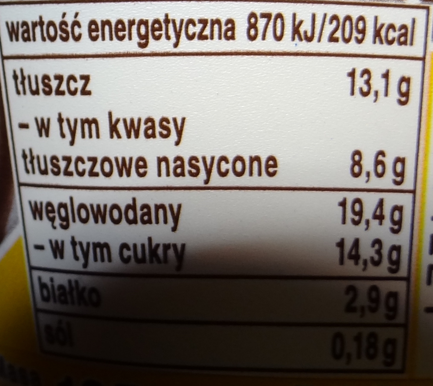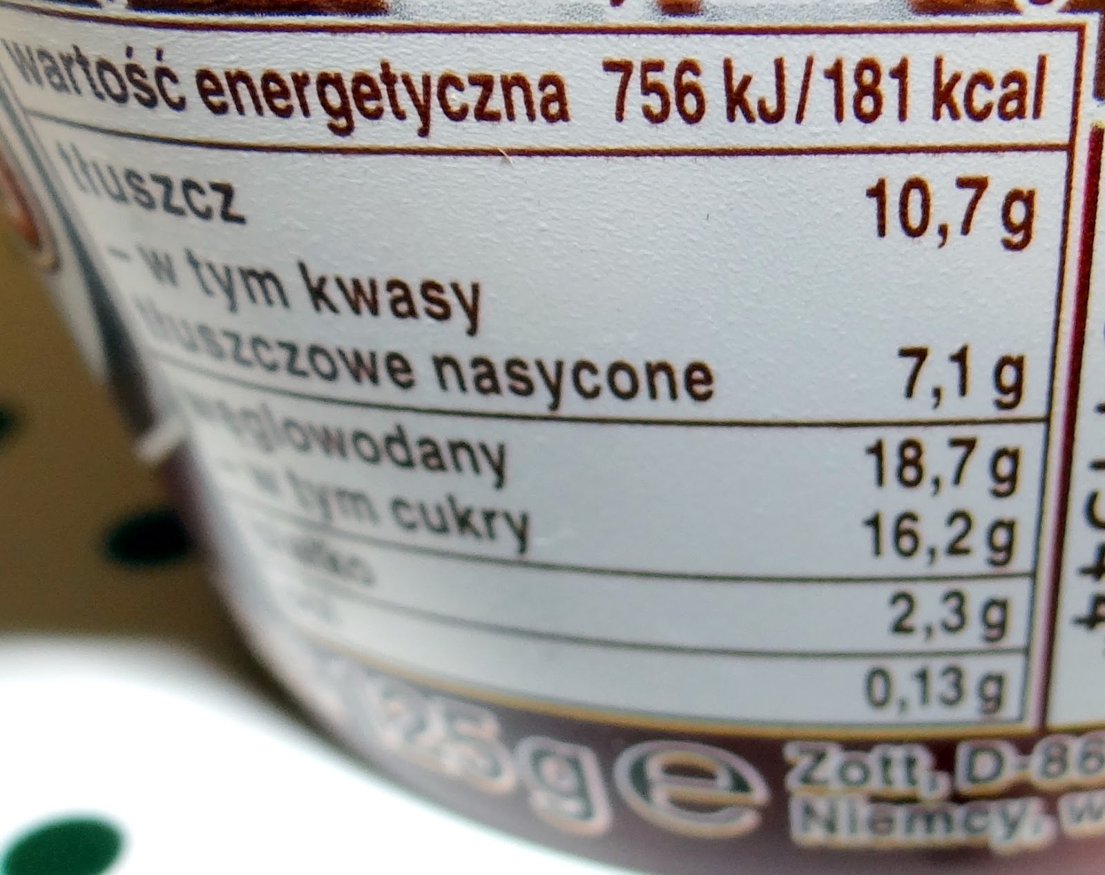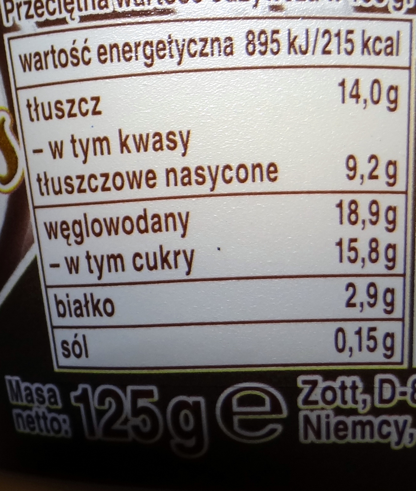 Płatki fajnie chrupią w zębach. Po dodaniu do kremu nadal pozostają chrupiące, czekolada się nie rozpuszcza a płatki nie ulegają napęcznieniu. Uzyskujemy wiec idealnie chrupiące płatki oblane czekoladą zatopione w pysznym mleczno-orzechowym puddingu. Założę się, że ten wariant smakowy pokochają wszystkie dzieciaki. Płatki te dedykowane są dla osób określanych mianem "Chodzący spokój" MLEKO(45%), ŚMIETANKA, cukier, płatki kukurydziane w czekoladzie* (7,2%)(cukier, kasza kukurydziana, tłuszcz kakaowy, MLEKO w proszku pełne, miazga kakaowa, SERWATKA słodka w proszku, LAKTOZA, ekstrakt słodu JĘCZMIENNEGO, sól, emulgatory: lecytyna słonecznikowa, lecytyna SOJOWA, substancja glazurująca: guma arabska, aromat, skrobia modyfikowana, kakao w proszku o obniżonej zawartości tłuszczu(0,7%), zmielone ORZECHY LASKOWE(0,5%), czekolada w proszku(0,5%), substancja zagęszczająca: karagen, mączka chleba świętojańskiegoMonte Choco Flakes, Zott