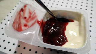 Dodatek wiśniowy jest lekko słodki ale zdecydowanie kwaśny, nie jakoś wybitnie ale tak, że po prostu mocno mi smakuje. Tego dodatku nie da się raczej jeść odrębnie. Trzeba go połączyć z kremem Monte.