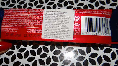 Na odwrocie informacje na zadruku są w języku niemieckim, natomiast batonik ma polską wlepkę, więc wszystko co w miarę najważnijsze na niej sie znajduje.