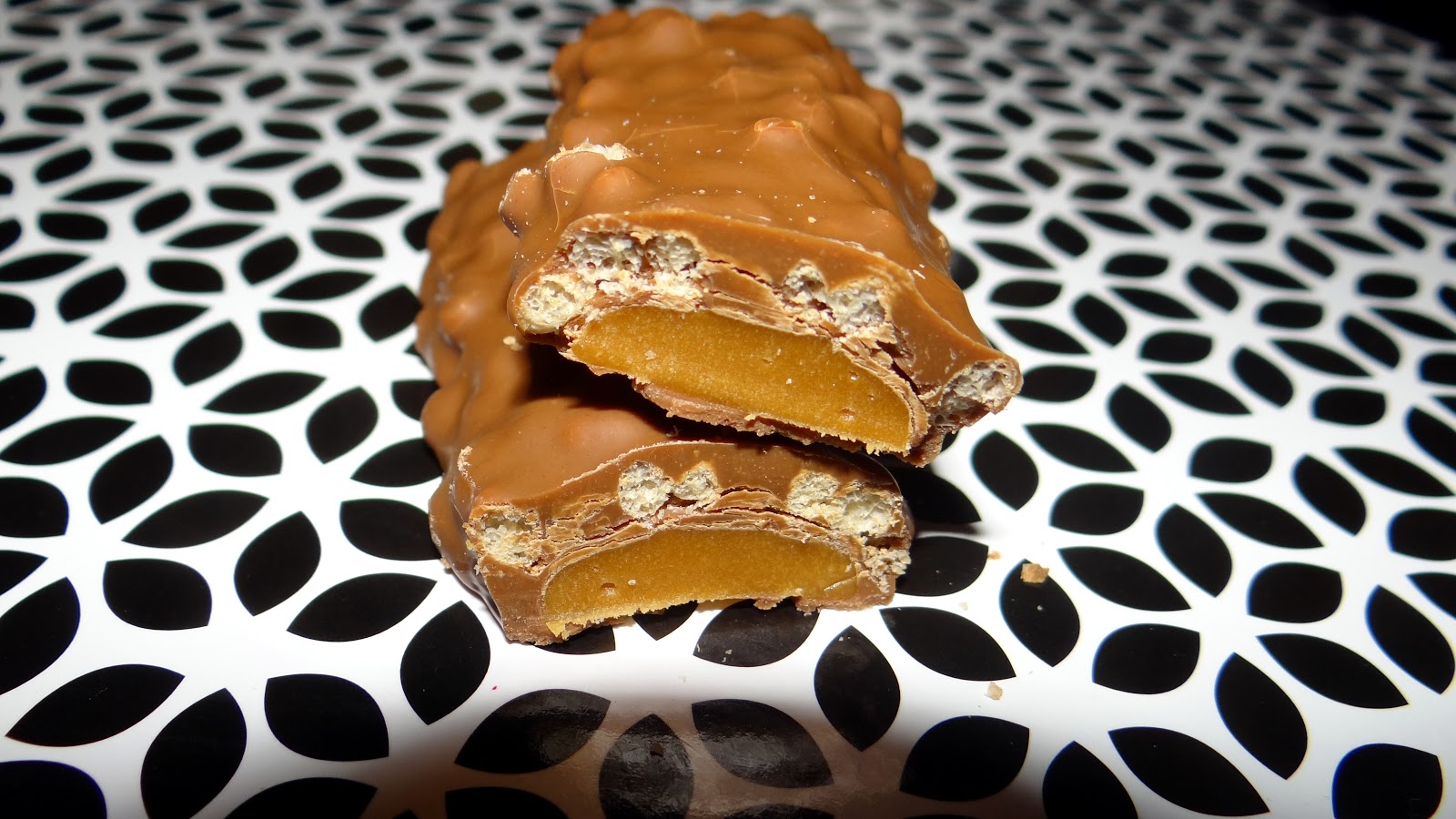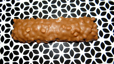 Wewnątrz w przekroju wygląda o wiele lepiej niż na zewnątrz. Podstawa batonika to delikatna warstwa czekolady mlecznej. Na tej bazie ułożony jest podłużny