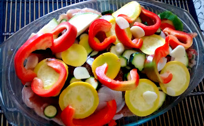 2. Warzywa kroimy w plastry, układamy na filetach. Solimy. Podlewamy winem. Przykrywamy i pieczemu ok. 40 minut. (10 minut przed końcem jeśli mamy dużo wywaru można odkryć przykrywkę)