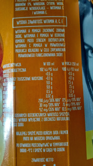Smak:Sok jest neutralnie słodki, bardzo dobrze smakuje. Mocno gęsty, osiada na zębach i przełyku a przez to bardzo sycący. W smaku najbardziej dominuje marchewka, jednak banan daje mocno o sobie znać.