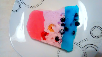 4. Niebieskie galaterki rozpuścić w 600 ml wody. Odstawić. Gdy zaczną lekko tężeć wsypać jagody i wymieszać. Przełożyć do formy. Ponownie odstawić do całkowitego stężenia.