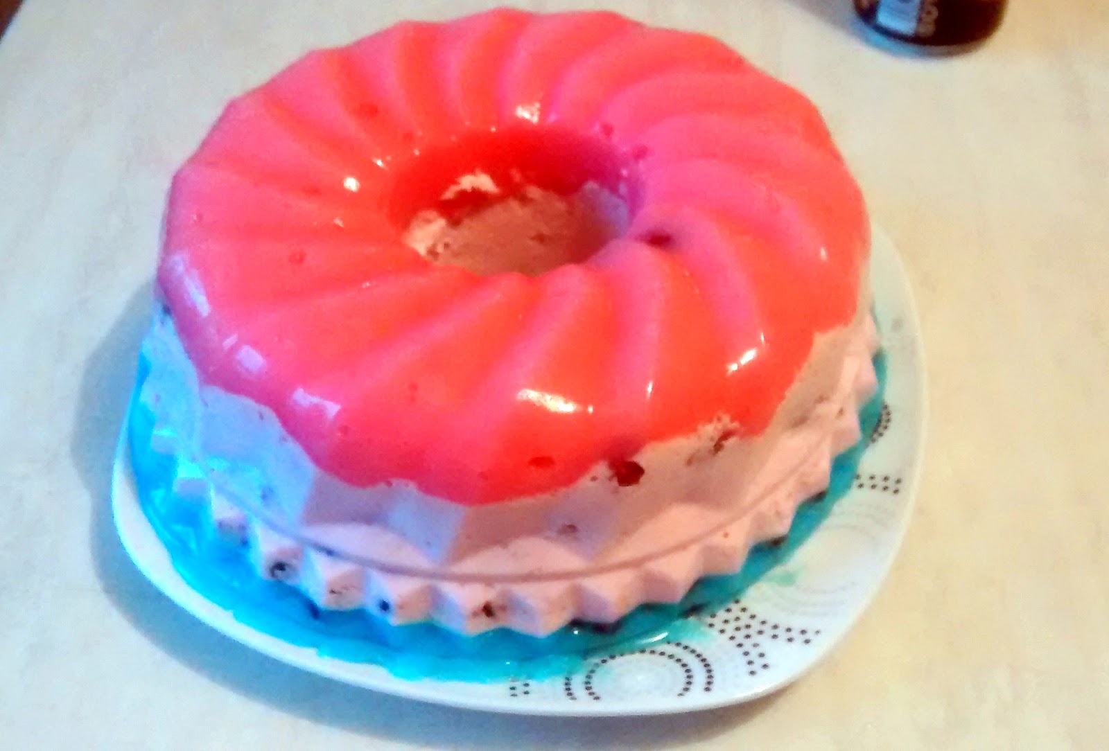 1. Różowe galaretki rozpuszczamy w 600 ml wody. Gdy galaretki zaczną tężeć, przelać je do silikonowej formy na babkę. Wstawić do lodówki. Odczekać aż stężeje niemal całkowicie.