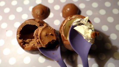 czekoladowa kopuła. Jajeczka są urocze i naprawdę ich estetyka zasługuje na uwagę. W środku jaja widać łączenie czekoladowym spoiwem.