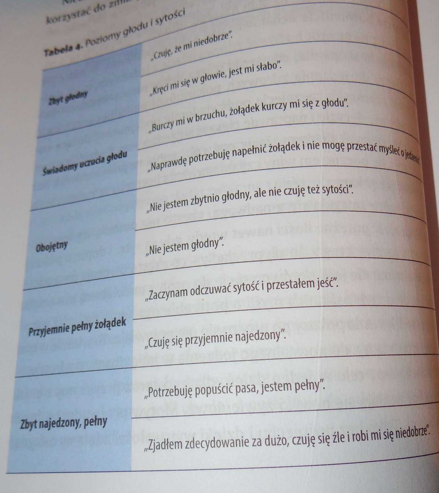 diety to krótkotrwałe i chwilowe rozwiązanie, a nauczenie się zdrowego odżywiania, mimo iż nie gwarantuje spadku wagi daje lepsze korzyści dla zdrowia. By zdrowo się odżywiać trzeba nauczyć się kontrolować uczucie głodu i sytości, co jest bardzo trudnym zadaniem, a pomóc ma w tym tabela (zdjęcie obok). Należy pamiętać też o progu 20 minut od pierwszego kęsa do wysłania impulsu nerwowego o nasyceniu. Autorka omawia też