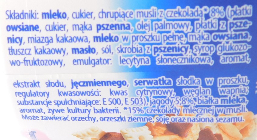 miks zbożowych składników, kruchych herbatniczków i czekoladowych kostek. Na kompozycję zbóż składają się mniejsze i większe zbożaki: płatki i otręby: owsiane i pszenne. Płatki są twardawe, choć w połączeniu z jogurtem nabierają gumowatości.