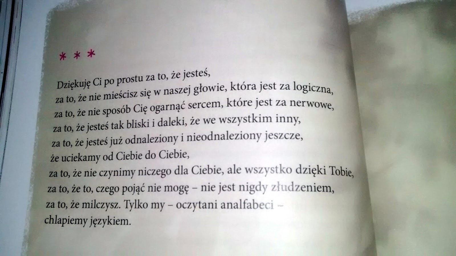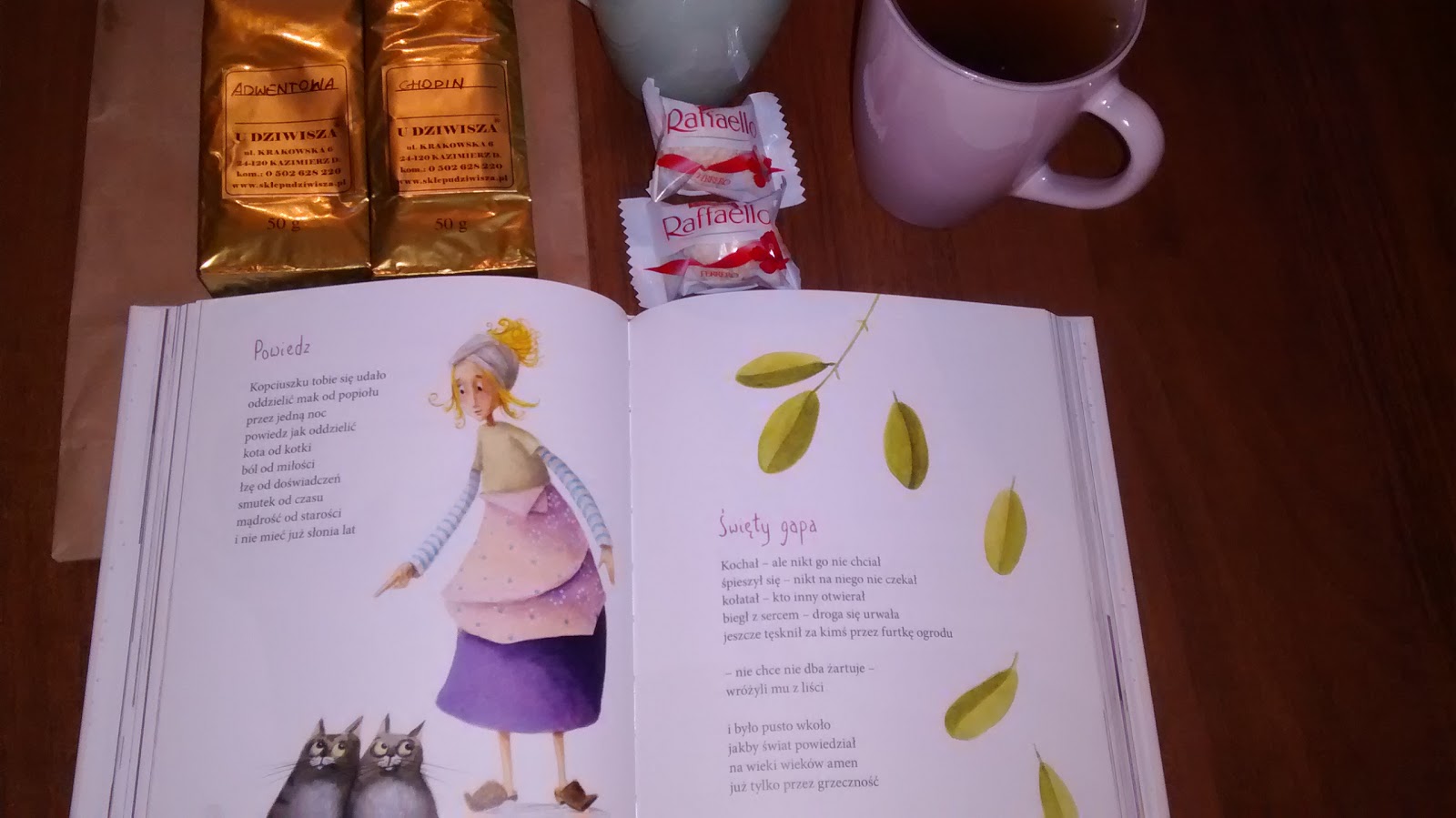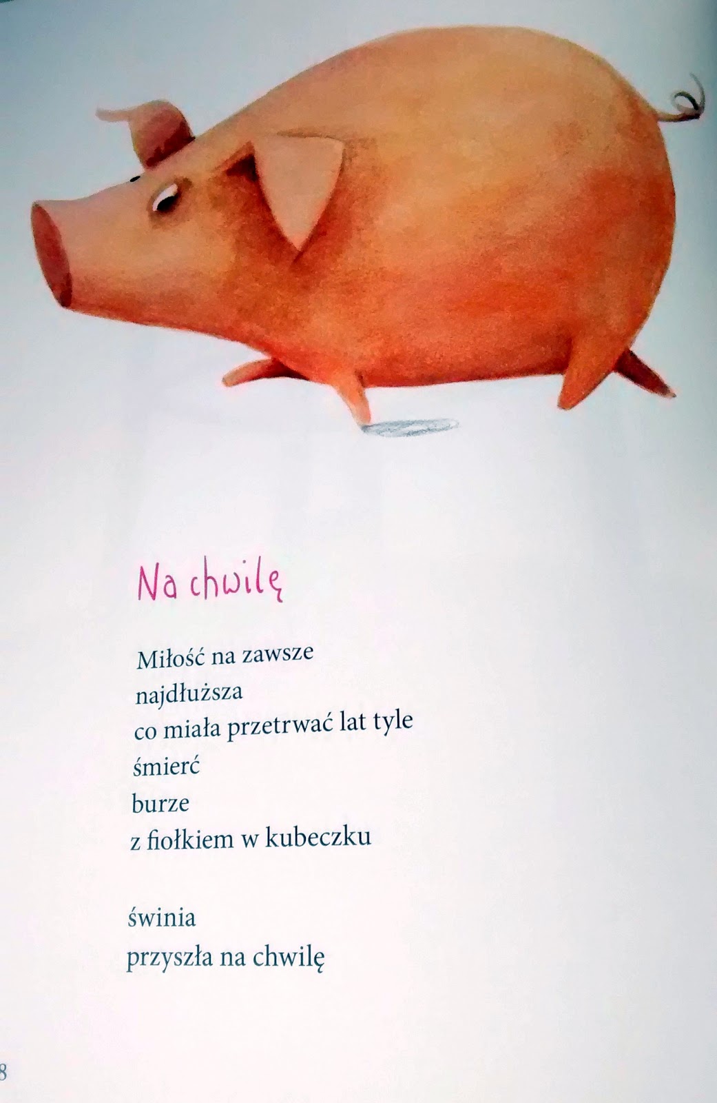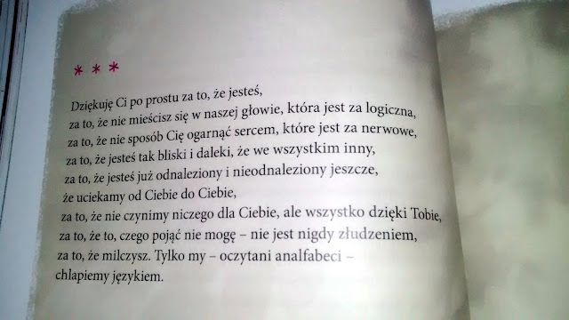 Zawsze traktowałam wiersze Twardowskiego osobiście i zawsze dorośle. Nawet jak przysiadła nad wierszem sójka, jak wisienka zamieniała się w uczucie a aniołki fruwały tanecznie to nigdy nie miałam wyobrażenia, że mogą to być wiersze dla dzieci. Dla mnie były dorosłe, choć uczyły mnie, że nie wolno pompatycznie do nich podchodzić, że każdy człowiek jest wrażliwy i trochę nierozumny, tylko trzeba w sobie tę lekkość odnaleźć.