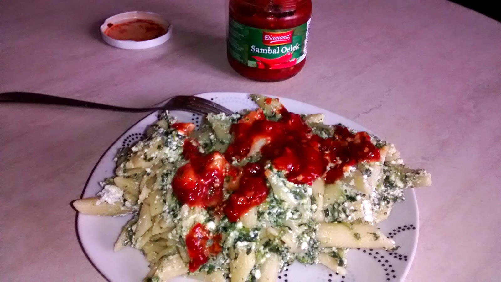 Makaron szpinakowo-białkowy z sambal oelek