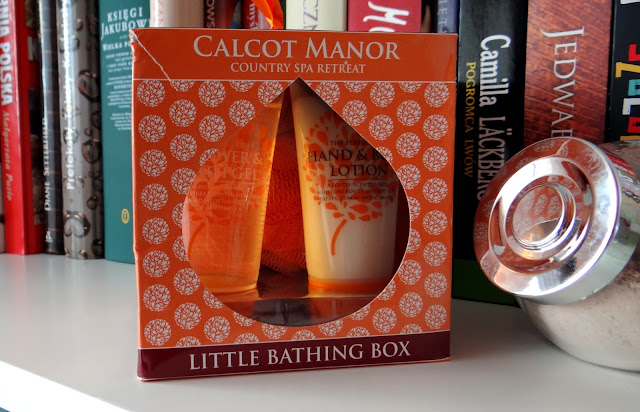 Mały zestaw SPA, Calcot Manor Zestaw opakowany jest w kartonowe pomarańczowe pudełko z ornamentowym motywembiałych okrągłych niby-dmuchawców.