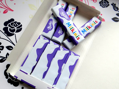 Milka Milkinis ukryte są w prostokątnym kartonowym pudełeczku, które wyglądem przypomina opakowania lepszej klasy czekolad (choć to już chyba nie wyznacznik :P)