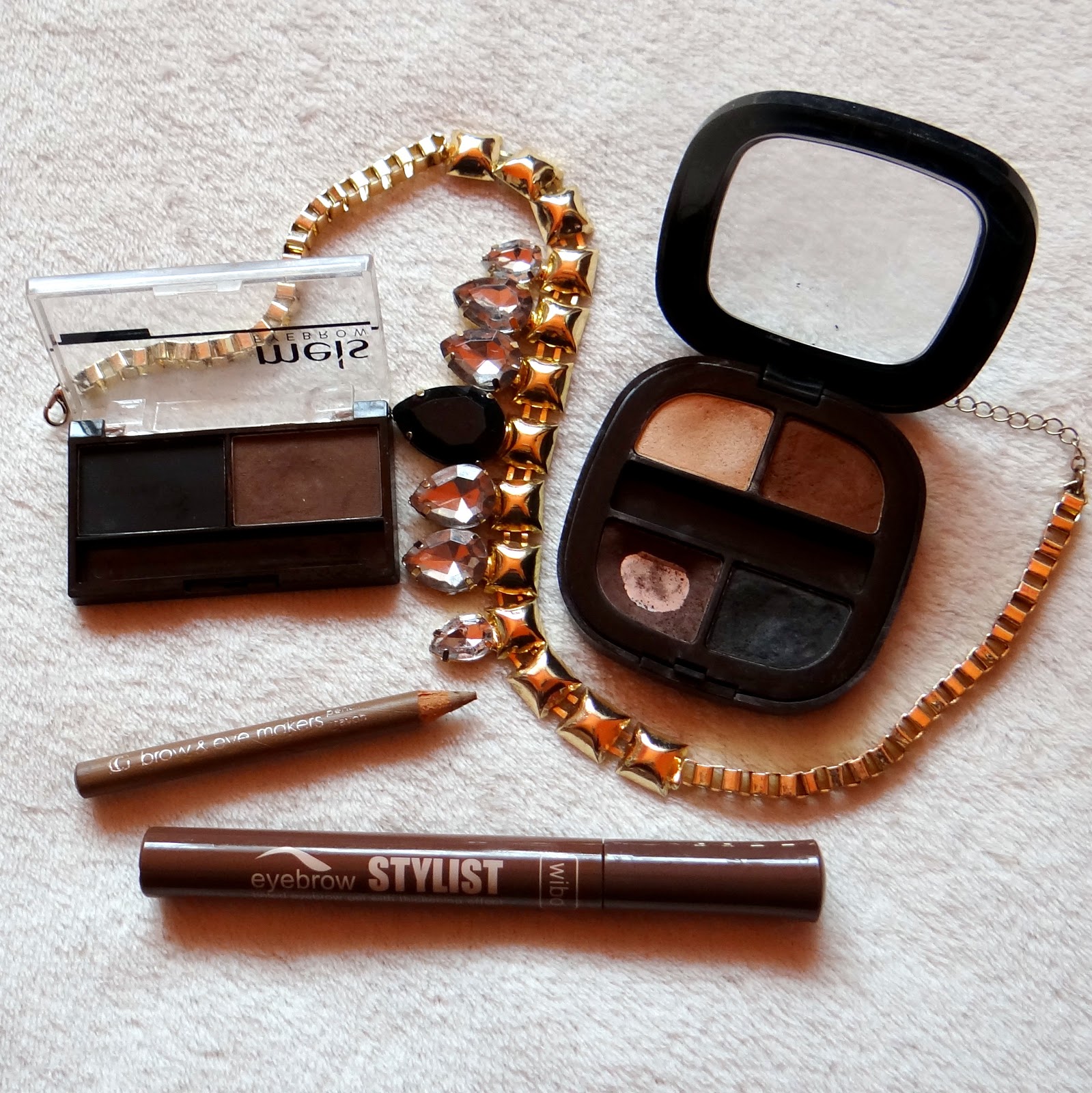 poczwórne cienie W7, kupiłam je gdy wyszły na rynek. Jasny zupełnie nie barwi brwi, nie będzie dobry nawet dla blondynek, rudo-brązowy nada się tylko dla rudzelców, ten brąz zużyty przeze mnie to najlepszy dla mnie kolor i ostatni, czarny używam sporadycznie.