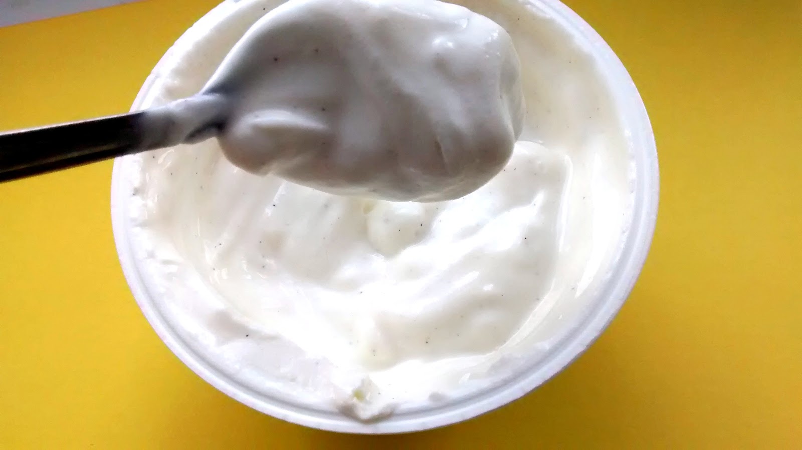 bardzo gęsty. Po otwarciu osiada gęstszą warstwą przy brzegach, jednolitej konsystencji nabiera po wymieszaniu. Kolor kremowy, z widocznymi ciemnymi drobinkami wanilii, co na początku odebrałam jako pieprz