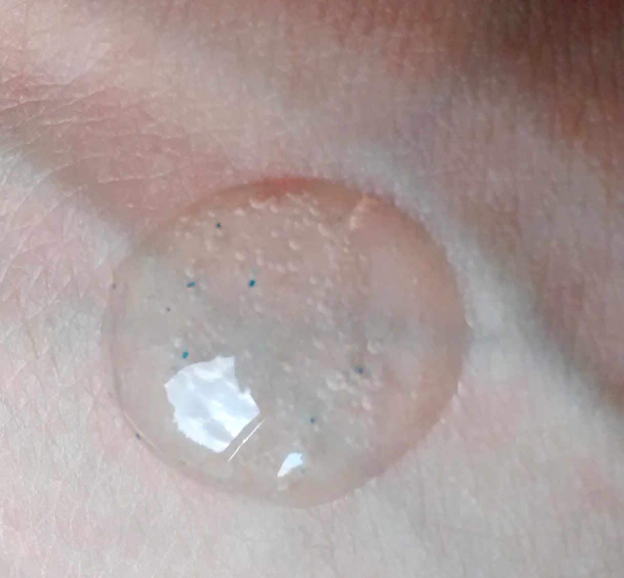 ęcherzyki powietrza i maleńkie niebieskie grudki. Łączy w sobie cechy dwóch produktów, bo po pierwsze jest typowym żelem myjącym, a po drugie wzbogacony o mikroziarenka
