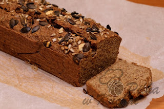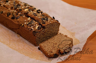 Ciasto przełóż do formy wyłożonej papierem do pieczenia o wymiarach 10x20 cm. Ciasto oprósz pestkami dyni i słonecznika.