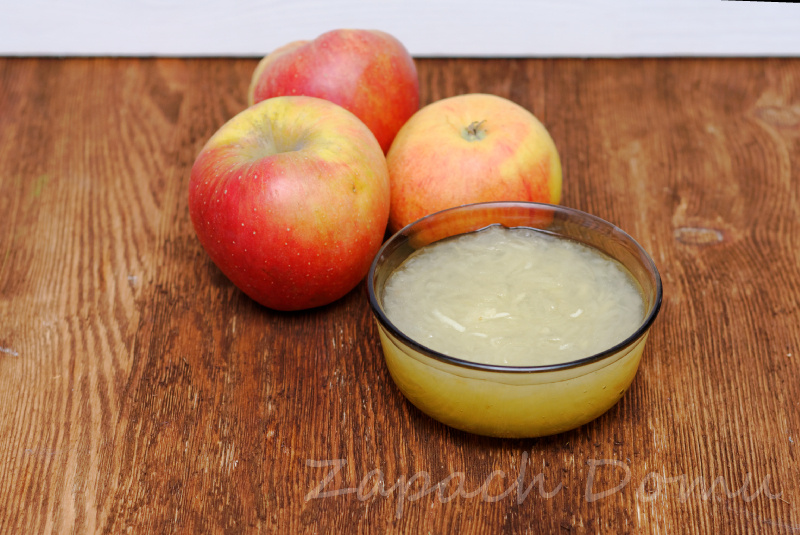 Jabłka umyj, obierz i zetrzyj na tarce. Starte owoce wrzuć do wrzącej wody. Gotuj 3-5 minut. Następnie w 1/3 szklanki zimnej wody rozmieszaj mąkę ziemniaczaną. Wlej do gotujących się jabłek. Gotuj 2-3 minuty.