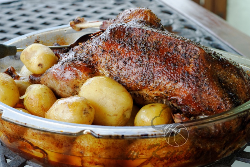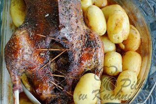 Po upływie tego czasu zdejmij pokrywkę, włącz termoobieg i piecz w 185 st. przez 1 godzinę 15 minut. Od czasu do czasu polewaj kaczkę powstałym sosem.