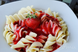 Makaron wyłóż na talerz, polej musem truskawkowym i ... zajadaj z apetytem :)