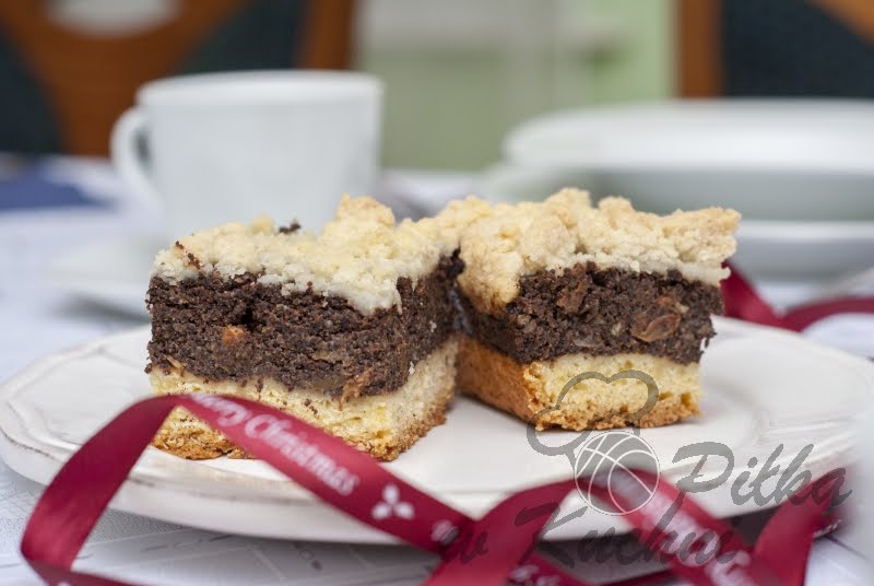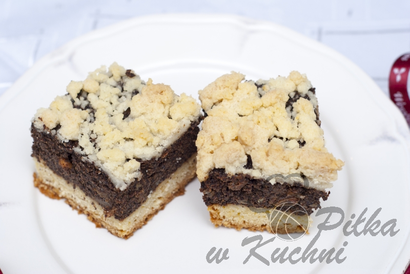 Na blachę wyłożoną papierem do pieczenia wyłóż ciasto i wylep nim formę. Spód nakłuj widelcem. Ubij pianę z 2 białek i wyłóż ją na spód. Następnie wyłóż i równomiernie rozsmaruj masę makową. Całość posyp kruszonką zagniecioną z 1/2 kostki masła, 1,5 szkl. mąki, 1/2 szkl. cukru i cukru waniliowego.