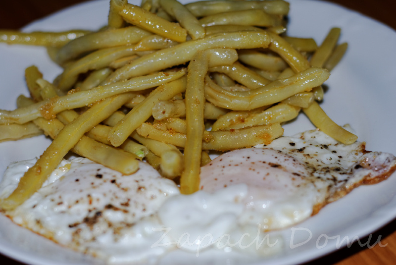 Pod koniec gotowania fasoli zaczynam przygotowywać jajka. Na mała patelnię (taką na jedno jajko) wlewam sporo oleju. Gdy się rozgrzeje, wbijam jajko. Cały proces smażenia przebiega podczas polewania jajka gorącym olejem za pomocą łyżki. Gdy z wierzchu jajko jest ścięte, wykładam na talerz. Usmażone jajko solę i pieprzę :)